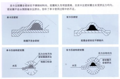 双卡压式胶圈密封在不锈钢材料内,胶圈耐久性明显提高,且双卡压密封圈左右受挤压均匀,密封圈不会从侧面倍水压挤出,弥补了单卡压适用过程中的不足。