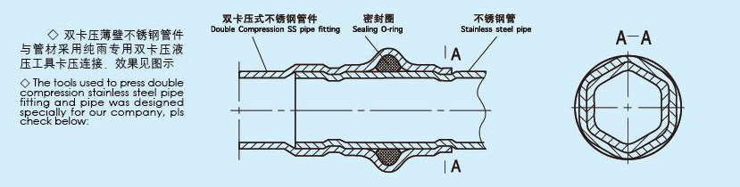 不锈钢双卡压管件中双卡压的含义是一种利用金属材料的效刚性和密封材料的弹性压缩比原理,在管件的U型槽的两侧用一种专门的卡具,进行压接的管道方式,这种连接管道方式,我们称之为双卡压式,这种连接管道的方式充分利用了承接口的长度。