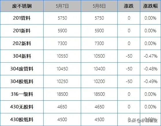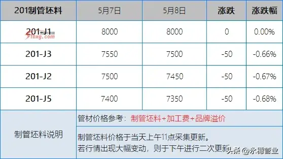 较昨日早间,今日早间市场201报价多数持平,个别下跌50元/吨;304报价下跌20-50元/吨,个别高位下跌100元/吨,目前主流报价区间:201新料在5850-5950元/吨;304新料在10400-10500元/吨。