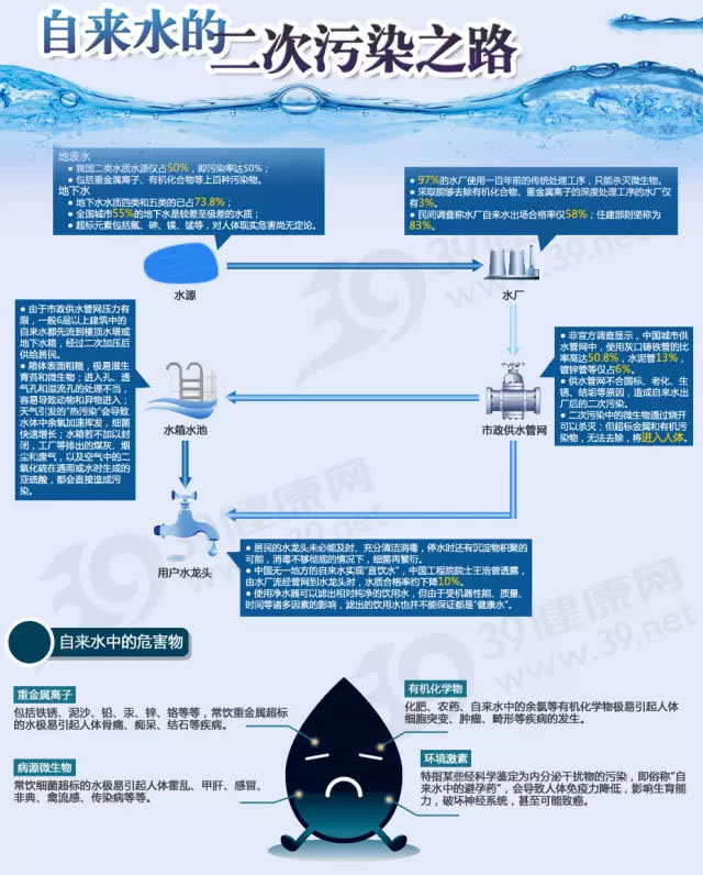 自来水的污染源有很多,其中大的污染源来源于二次供水,如果您是住在高层住宅,每天打开家中的水龙头时,您是否清楚,水龙头流出的水其实并不是由自来水公司直接供给,而是通过小区的二次供水设备把设置在楼顶端蓄水池里的水经过加压后才送到您家的。